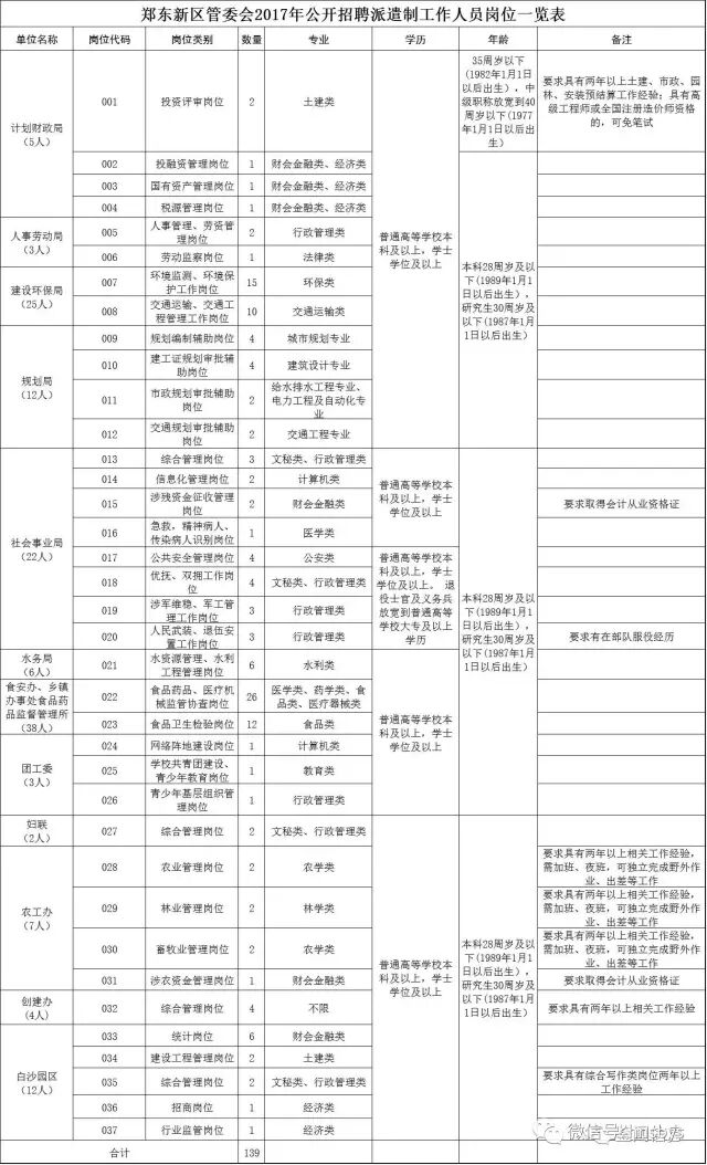 本次计划招聘工作人员139名。招聘岗位、人数、资格条件等要求详见《郑东新区管委会2017年公开招聘派遣制工作人员岗位一览表》。专业设置参照河南省2016年统一考试录用公务员专业类别。