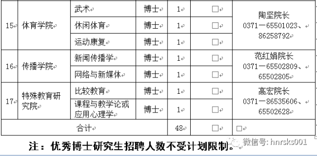 2017年计划招聘48名博士研究生(教授),具体专业要求见附件1《郑州师范学院2017年招聘博士研究生(教授)计划表》。